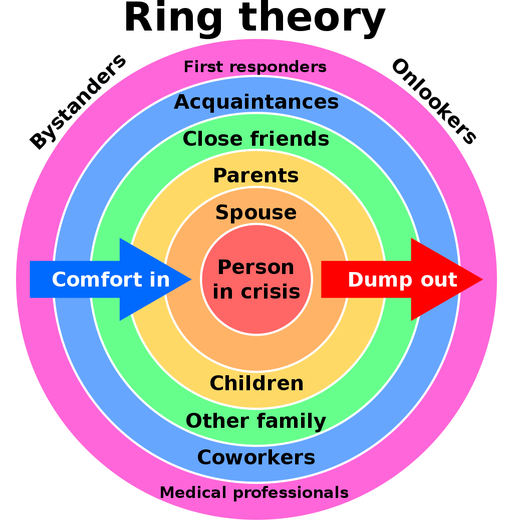 When you are talking to a person in a ring smaller than yours, someone closer to the center of the crisis, the goal is to help. Listening is often more helpful than talking. But if you're going to open your mouth, first ask yourself if what you are about to say is likely to provide comfort and support. If it isn't, don't say it. Don't, for example, give advice. People who are suffering from trauma don't need advice. They need comfort and support. So say, "I'm sorry," or, "This must really be hard for you," or, "Can I bring you a pot roast?" Don't say, "You should hear what happened to me," or, "Here's what I would do if I were you." And don't say, "This is really bringing me down."