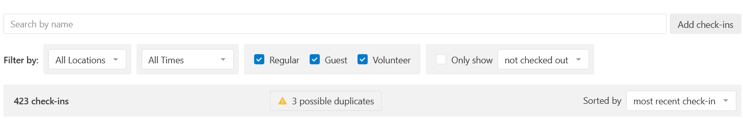 When inputting any of these data, you will be prompted to remove all duplicates as they occur. Sometimes these happen though manual input, sometimes congregants check themselves in twice. This is common. You will see this indicated by a yellow, error triangle at the top of the check-in list.